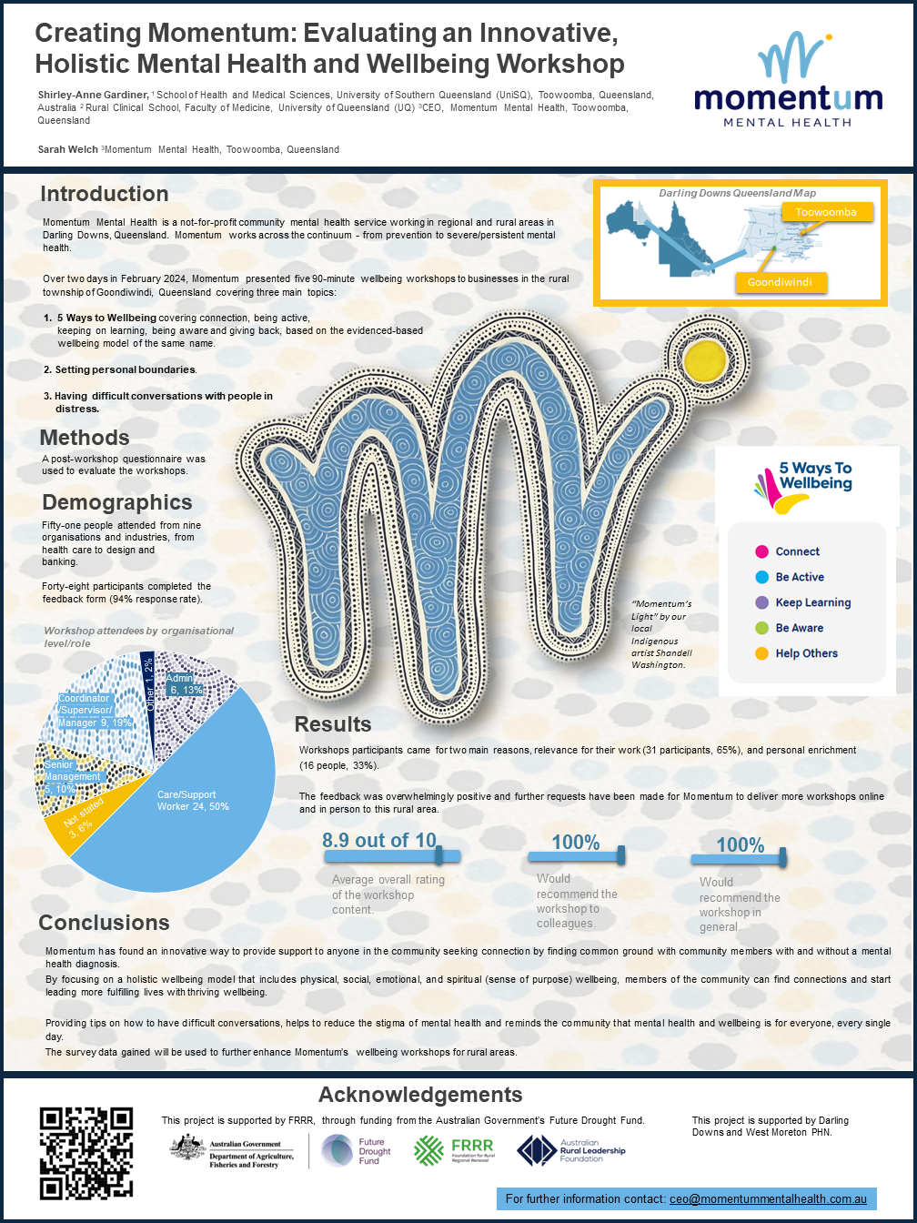 Momentum is one of the leading mental health and wellbeing organisations in the Darling Downs region. Below are our latest news articles as well as conference posters. For more information about conferences the organisation has presented at, click here.