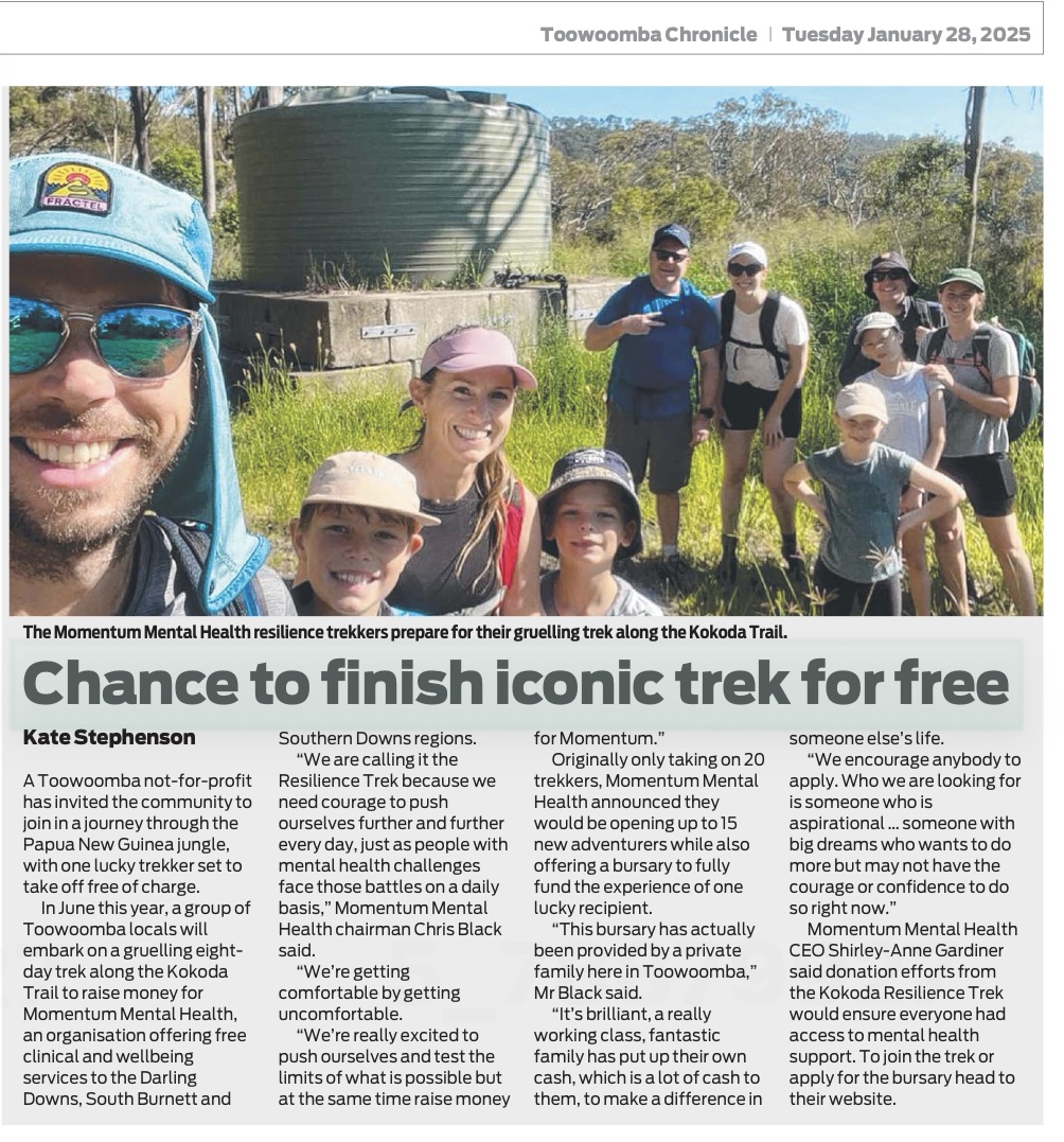 In January 2025, Momentum’s Board Chair discussed his Kokoda trek fundraising and a bursary opportunity with the Toowoomba Chronicle newspaper.