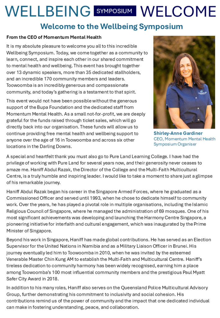 Momentum Mental Health, in collaboration with Pureland Learning College and with generous support from the Bupa Foundation, proudly to hosted a dynamic Wellbeing Symposium that aimed at strengthening mental, physical, and social wellbeing across the community. This full-day event brought together 13+ inspiring speakers from universities, general practice, community organisations, and clinical psychology to share practical insights and evidence-based strategies for creating healthier, more connected lives.