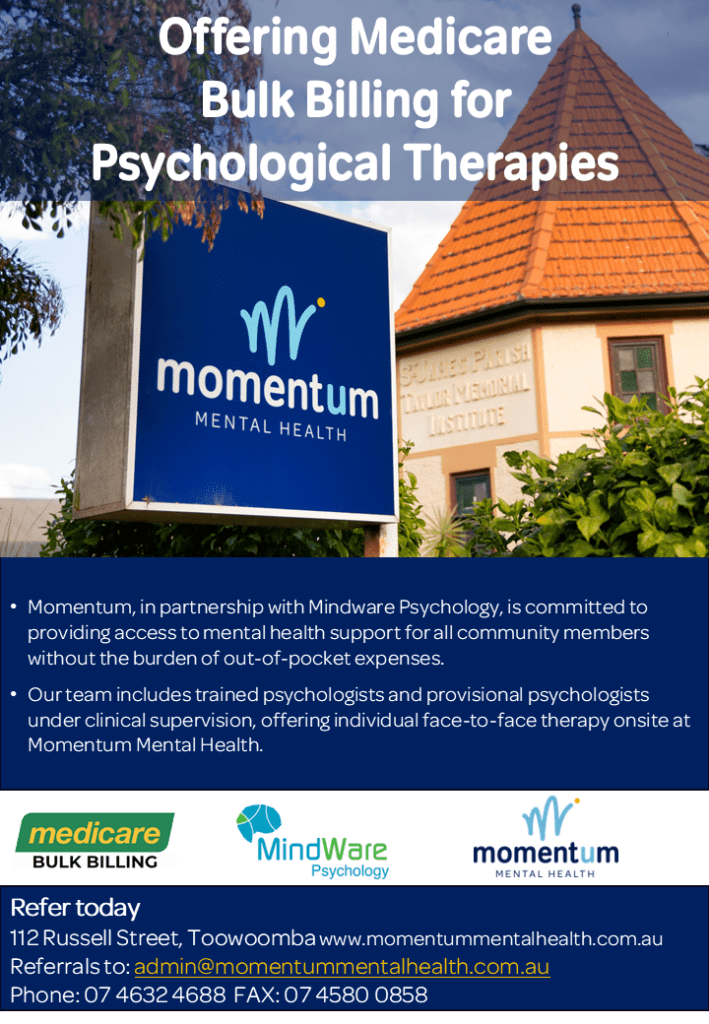 MindWare Psychology and Southern Queensland Rural Health are kindly supporting Momentum to provide bulk-billed (no out of pocket) clinical psychology support for those with moderate to severe mental health and wellbeing needs.