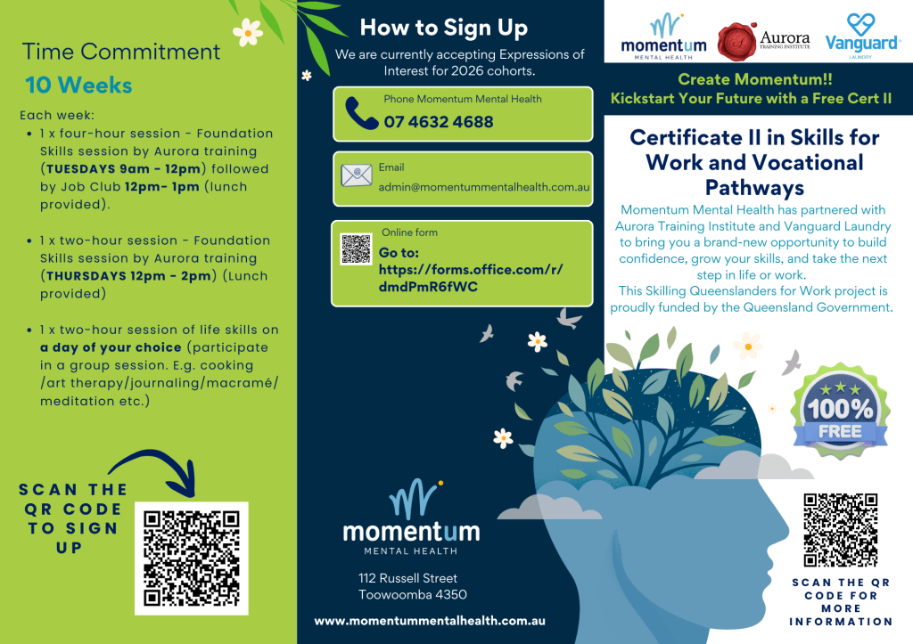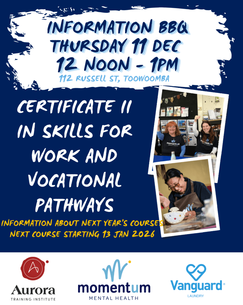 The next course is a ten week program starting Tuesday, 13 January 2026. An information session will be held on Thursday, 11 December 2025 at 112 Russell St, Toowoomba (Momentum’s main site).