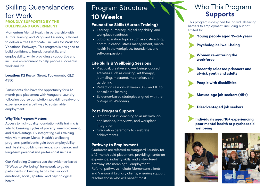 Momentum is thrilled to announce that we have received funding from the Queensland Government through the Skilling Queenslanders for Work initiative to deliver a free Certificate II in Skills for Work and Vocational Pathways.