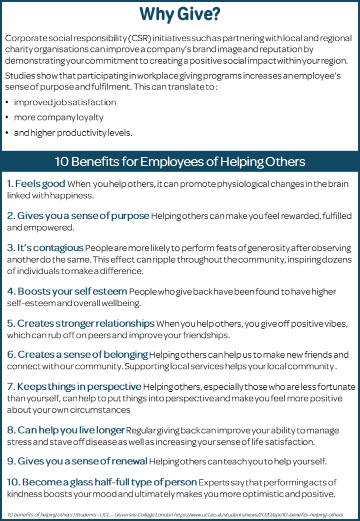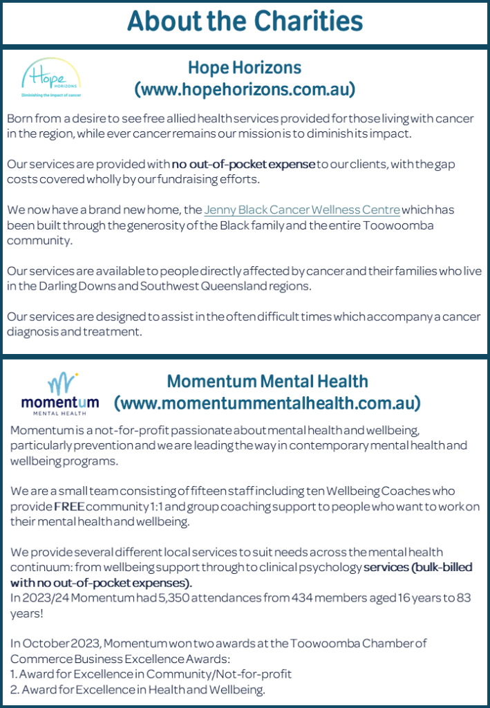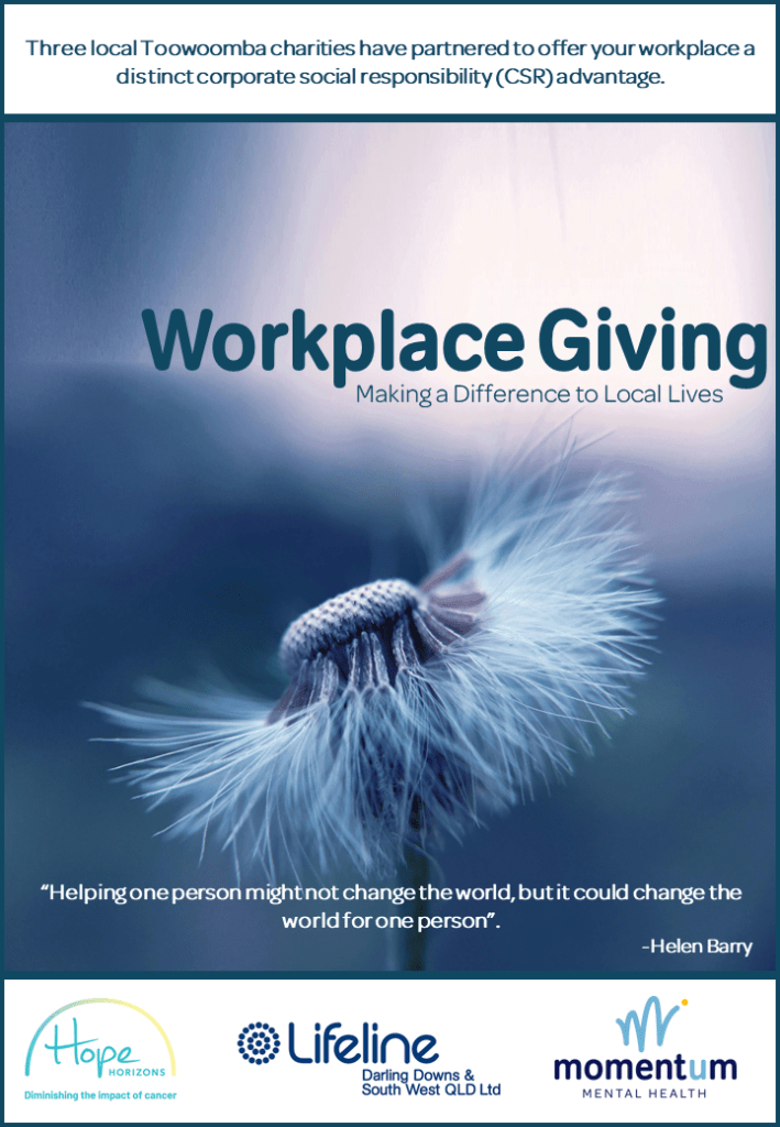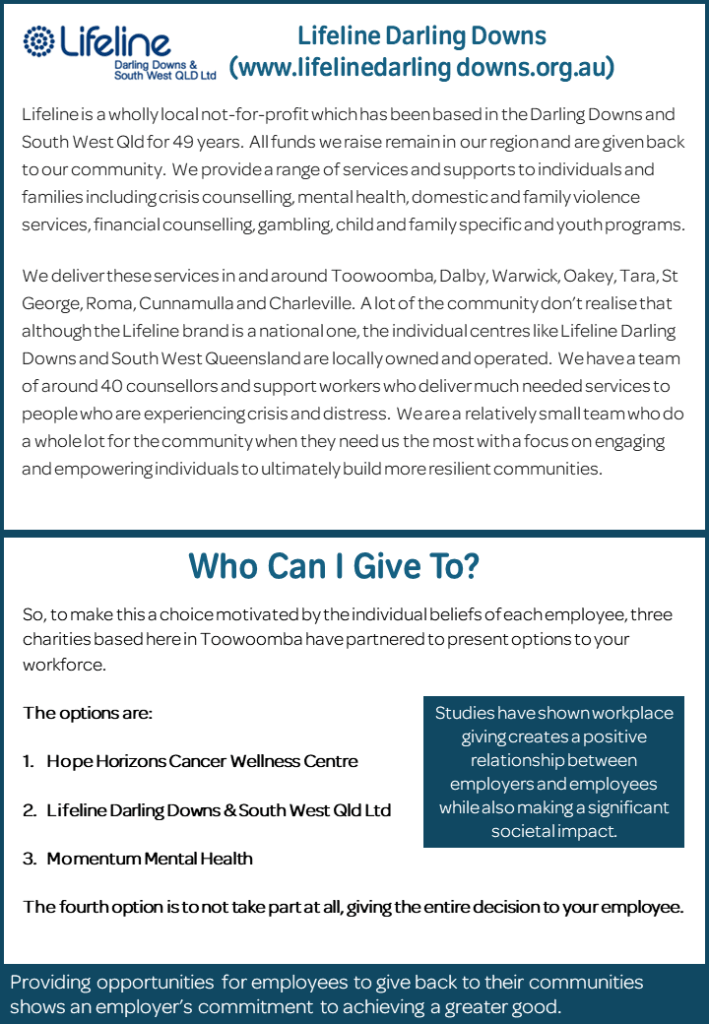 So, to make this a choice motivated by the individual beliefs of each employee, three charities based here in Toowoomba have partnered to present options to your workforce.