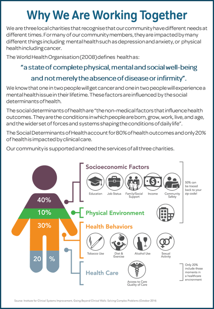 We are three local charities that recognise that our community have different needs at different times. For many of our community members, they are impacted by many different things including mental health such as depression and anxiety, or physical health including cancer.
