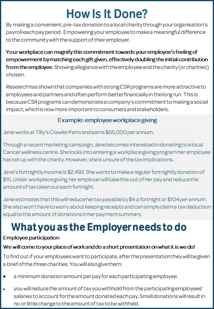 By making a convenient, pre-tax donation to a local charity through your organisation’s payroll each pay period. Empowering your employee to make a meaningful difference to the community with the support of their employer.